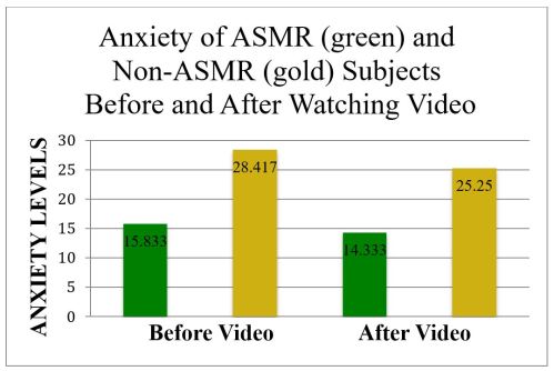 “It surprisingly did! While calculating anxiety levels before and after watching the video, I discovered that there was a very large significant difference for those who do and do not experience ASMR (F(1,16)=33.598, P=.000); those who do experience ASMR reported less overall anxiety.